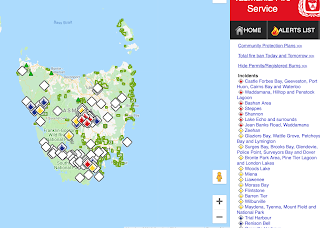 We have strong winds, high temperatures and low humidity today. Predicted max of about 37C. There's a bushfire West of us at Tahune, about 20km away, which has burnt out about 2000 ha and is out of control. At present it is tracking to pass just South of us, if the wind direction holds. Several communities in our area are at risk, including Geeveston. We are under a Watch and Act notice.